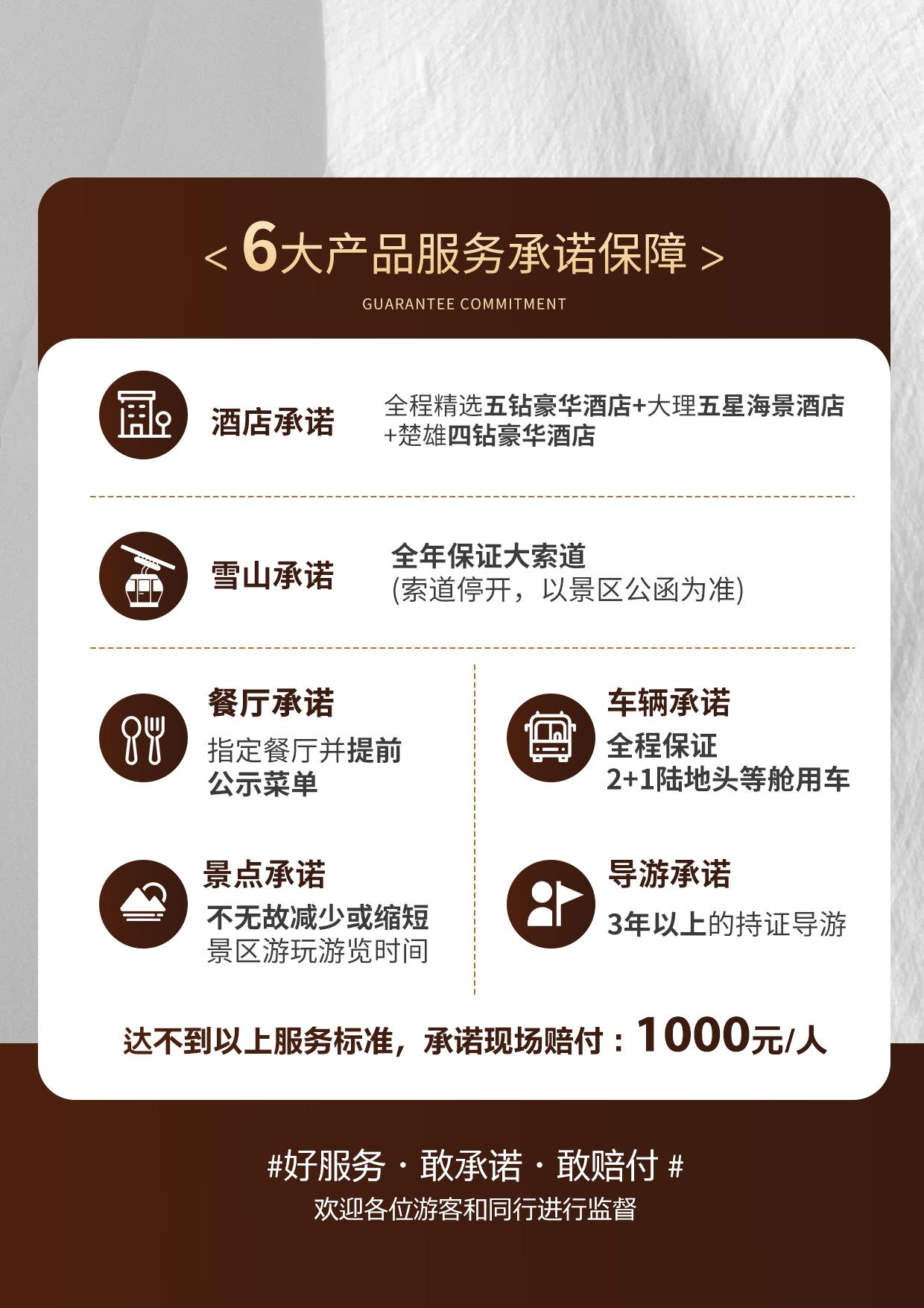 服务标准:行程中所安排导游为持有国家导游资格证、并有五年以上从业经验的金牌导游安全标准:旅行社已为游客购买了云南旅游组合保险(旅行社责任险)