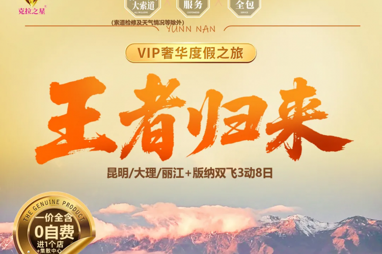 云南昆明+大理+丽江+西双版纳3动8日7晚跟团游克拉之星-王者归来VIP奢华度假之旅