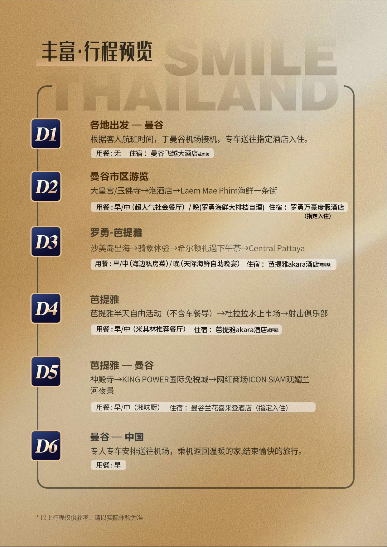 本产品是集酒店、美食、美景为一体的休闲度假式行程。住宿精心安排当地特色。经典景点和特色新网红景点相结合。各地抵达航班的时间不同,根据出团通知书通知集合地点出发,您的专属旅行管家会在出发前 2 天与您联系,客服会在群里发送【泰国旅游注意事项】【机场接机视频】【机场接机订单】【酒店入住卡】【导游微信】有任何当地需要咨询的问题都可以咨询您的专属管家。全国各地的游客欢迎您抵达“微笑之国“”宝石之都“的泰国,开启此次期待已久的愉快之旅。抵达机场走出安检找【泰国旅游观光协会】,提供护照和接机订单,由专车司机送您乘车前往酒店。您需要【提供入本人护照,酒店入住卡】手续即可办理入住,出发前请仔细阅【重要提示】,避免造成不必要的麻烦