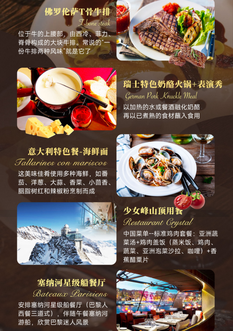 ◎全程每日午、晚餐以中式餐食为主(用餐标准为7菜1汤),如遇退餐7欧元/人/餐;